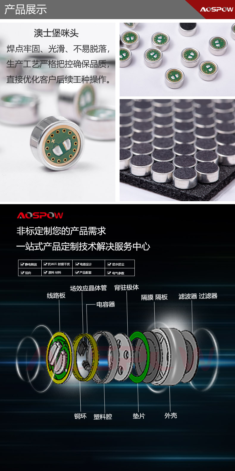 澳士堡22年mic廠家供應鵝頸麥克風、會議領夾麥用單指向雙電容咪芯抗干擾降噪9750咪頭,內含雙電容有效屏蔽射頻干擾信號,以及抗干擾磁珠,采用韓國RF管芯,質量穩(wěn)定可靠,適用于鵝頸麥克風、會議領夾麥等產品。
